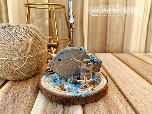 Un pequeño detalle para regalar: un portafotos con un memo clip sobre una pequeña rodaja de madera decorado con elementos marítimos.
